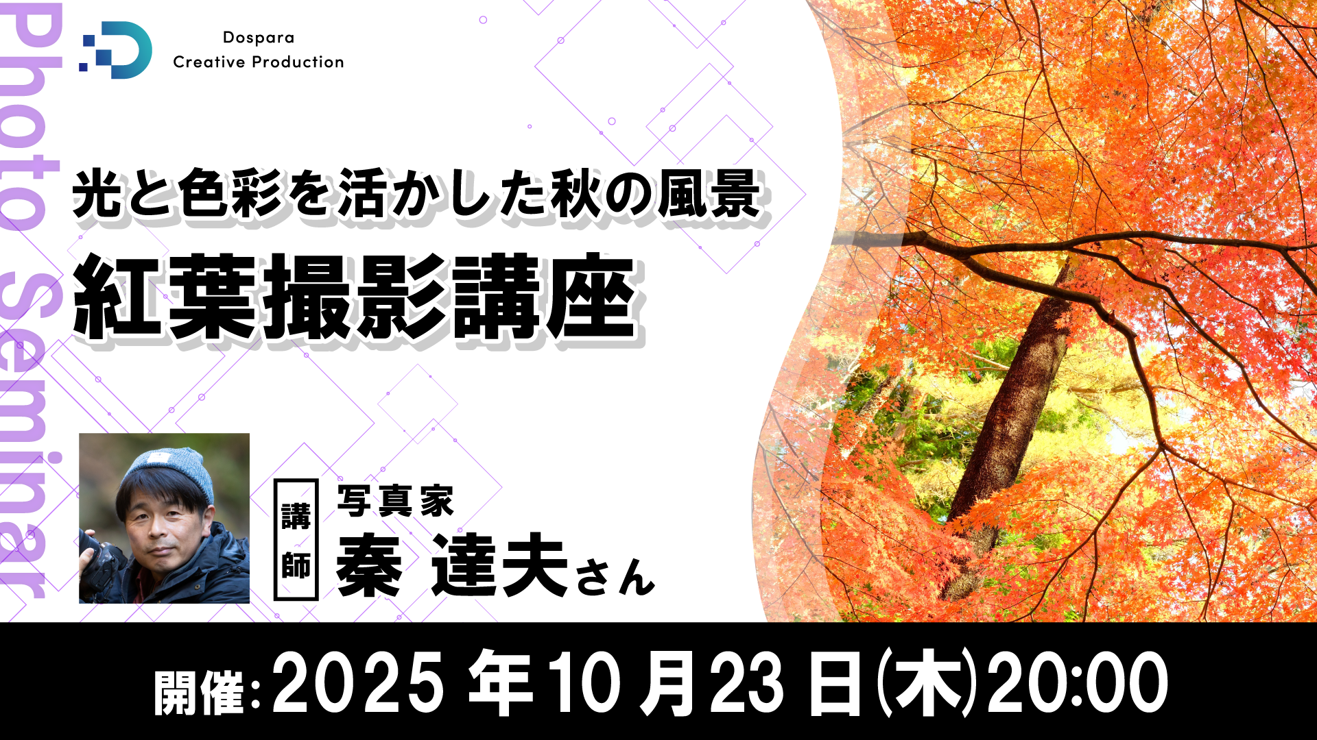 - 【ドスパラ】秋本番を前に光と色彩を活かした紅葉の撮影技術を学ぶ 写真家 秦達夫氏登壇 10月23日(木)20時より開催 参加者募集中
