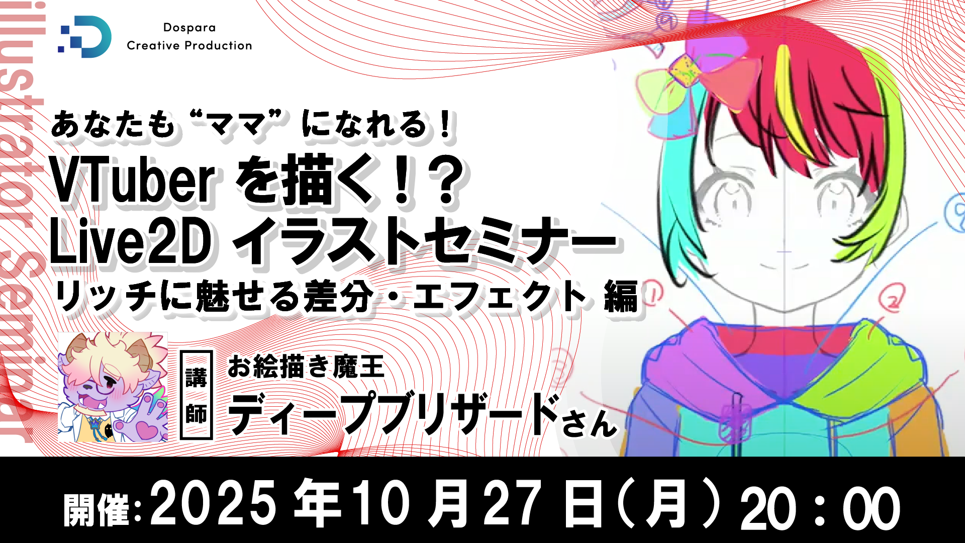 パソコン専門店ドスパラ(株式会社サードウェーブ 取締役社長 永井正樹 東京都千代田区)は、お絵描き魔王ことディープブリザード氏を講師に迎え、『VTuberを描く!?Live2Dイラストセミナー 第4弾 リッチに魅せる差分(パターンやバリエーション)・エフェクト(効果)編』 を2025年10月27日(月)20時よりオンラインで開催します。現在、参加者を募集しています。