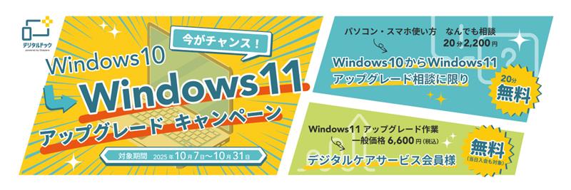 10月14日に予定されているWindows 10のサポート終了を前に、アップグレードへの不安や疑問を抱えるお客様が増えています。デジタルドックでは、安心してパソコンをお使いいただける環境づくりを目的に、期間限定でWindows 11へのアップグレードに関するご相談を、20分間無料で受け付けます。