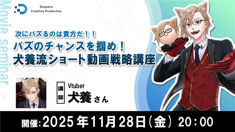 パソコン専門店ドスパラ(株式会社サードウェーブ 取締役社長 永井正樹 東京都千代田区)は、人気Vtuber犬養氏を講師に迎え、『バズのチャンスを掴め!犬養流ショート動画戦略講座』を2025年11月28日(金)20時よりオンラインで開催します。現在、参加者を募集しています。