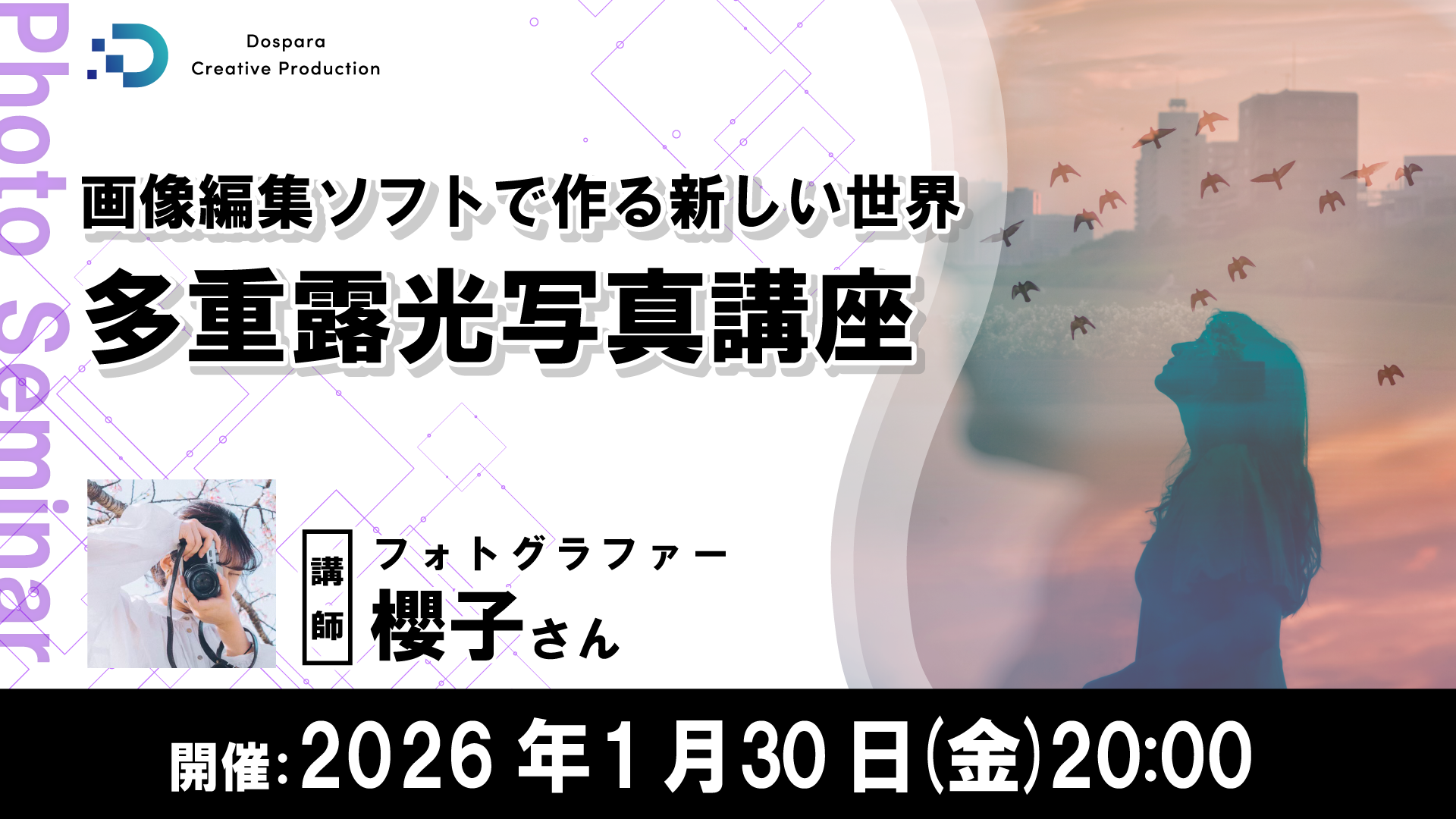 パソコン専門店ドスパラ(株式会社サードウェーブ 取締役社長 永井正樹 東京都千代田区)はフォトグラファーの櫻子氏を講師に迎え、『画像編集ソフトで作る新しい世界 多重露光写真講座』を2026年1月30日(金)20時よりオンラインで開催します。現在、参加者を募集しています。