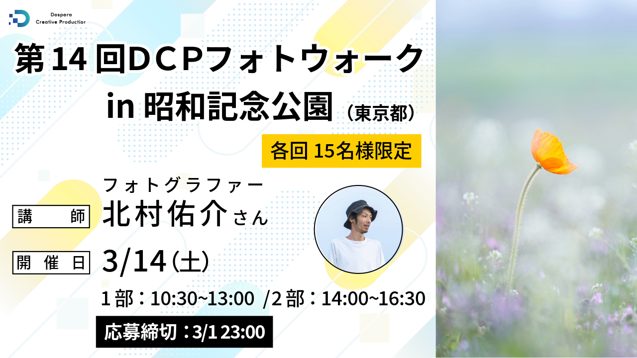 パソコン専門店ドスパラ(株式会社サードウェーブ 取締役社長 永井正樹 東京都千代田区)は、フォトグラファー北村佑介氏を迎え、『第14回DCPフォトウォーク in 昭和記念公園』を2026年3月14日(土)に開催します。現在参加者を募集中です。