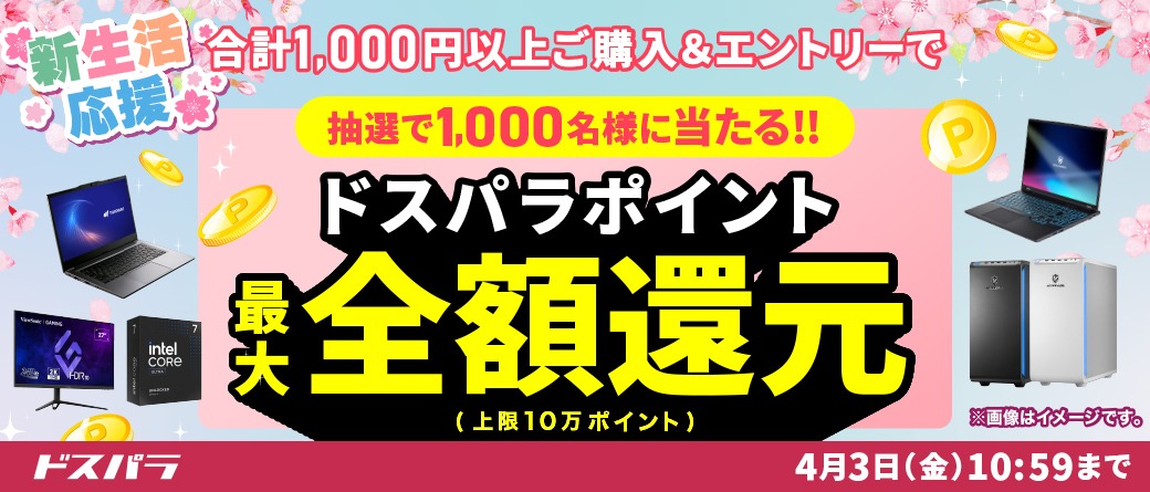 パソコン専門店ドスパラ(株式会社サードウェーブ 取締役社長 永井正樹 東京都千代田区)は、購入金額全額相当(上限10万円分)のドスパラポイントが抽選で当たる『新生活応援』キャンペーンを、全国のドスパラ店舗、および通販サイトにて、2026年2月20日(金)より開始しました。