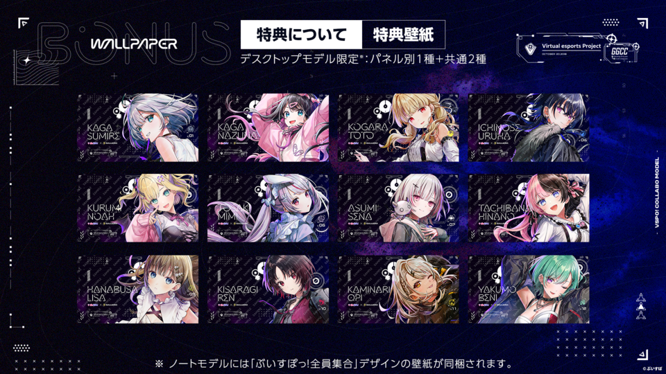 購入特典として、キャラクターがデザインされたステッカー、A4クリアポスターのほか、メンバー全員が集合した圧巻のデザインの壁紙3種をインストール済み。デスクトップで個別メンバーのカスタムパネルをオーダーされた場合は、集合デザイン2種と、メンバーに応じてデザインされた壁紙が1種という嬉しい組み合わせとなります。さらにデスクトップでは、お好きなメンバーのシステムボイスを選択でき、オリジナルの梱包箱でお届けします。